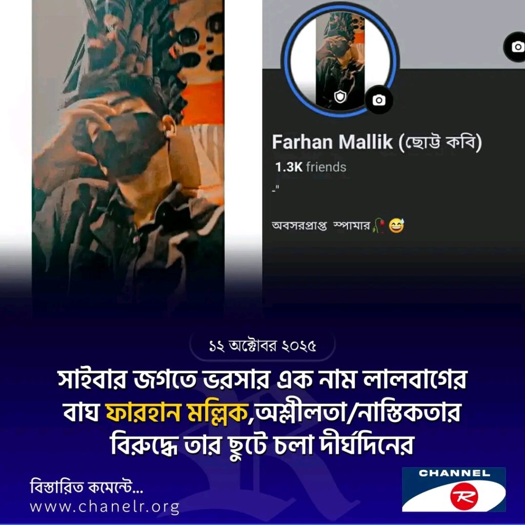 সাইবার জগতে ভরসার এক নাম লালবাগের বাঘ ফারহান মল্লিক,অশ্লীলতা/নাস্তিকতার বিরুদ্ধে তার ছুটে চলা দীর্ঘদিনের।Channel R কে ফারহান বলেন,আমার বাসা পুরান ঢাকা লালবাগ আমি অনেক বছর ধরে Cyber security সাথে সংযোগ এর মধ্যে বেশি কিছু টিমে কাজ করেছি একজন সিনিয়র হিসাবে বর্তমানে TEE RABEL SQUAD TEAM একজন সিনিয়র হিসাবে কাজ করে যাচ্ছি☺️❤️